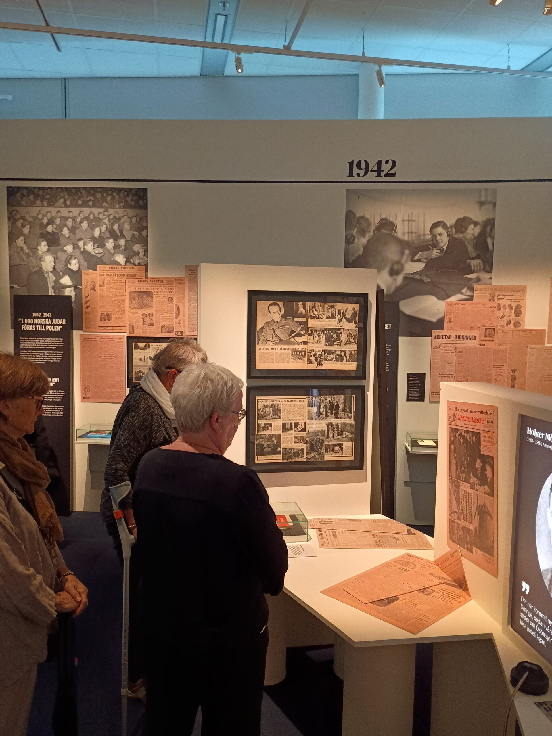 Det fanns dock motpoler i Alva ”Bang” Myrdal, Ture Nerman-tidningen Trots Allt, Torgny Segerstedt-tidningen Göteborgs Handel-och Sjöfartstidning. Andra tidningar som Aftonbladet, DN, Stockholm tidningen hade en liberal rapportering som ” judarna är lugna med gul stjärna eller ”badhus för judar”. Torgny Segerstedt tidning var främst i sin antinazistiska hållning. Från 1937 till1956 ägdes både Stockholmstidningen och Aftonbladet av den tysklandsvänliga Torsten Kreuger. Det finns många artiklar som kan nämnas för denna tid. Ett besök som tidigare nämnt är att rekommenderat för att få mer kunskap. En del pressformuleringar är tråkigt nog igenkännande från idag. Avslutningsvis bör nämnas att det var inte bara folk med judiska traditioner som blev drabbade. Romer blev förföljda på liknade nivå som Judar, t.ex. hade de ingen gul spjärna utan ett Z på sina kläder (Z för zigenare). De drabbades hårt av nazityska lagar. Blev tvångssteriliserade. Andra var homosexuella, dvärgar, progressiva, fackföreningsfolk, personer med funktionsnedsättning. Listan kan göras längre. Vi tackade guiden med en applåd och gick runt en stund och inspektera utställningen.