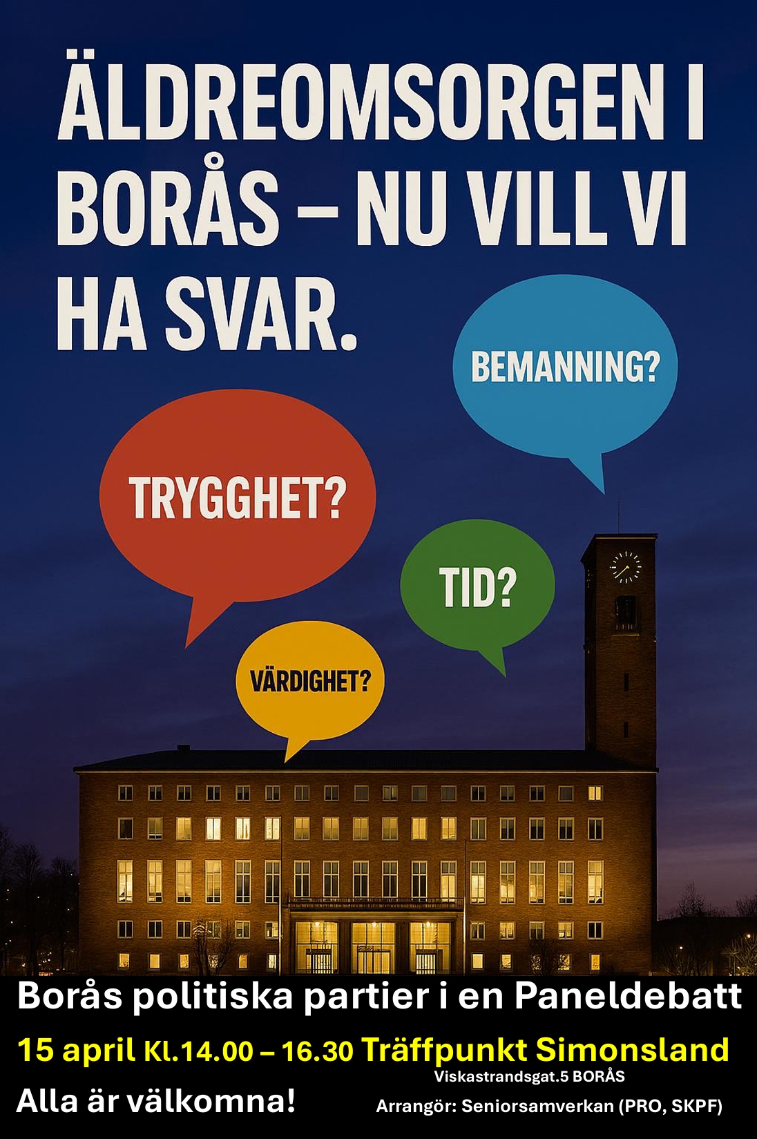 I vår strävan att skapa bättre förutsättningar för Borås pensionärer tar vi nu tillfället i akt, då det dessutom är valår, att kunna få besked från de politiska partierna i Borås Stad om deras syn på morgondagens äldreomsorg. Det kommer att krävas många och omfattande åtgärder för att förändra dagens äldreomsorg till det bättre. Dag: onsd. 15 april Kl. 14.00-16.30 ca Plats: Träffpunkt Simonsland, lokal Åsikten INGEN ANMÄLAN eller kostnad! Arrangör: Seniorsamverkan i Borås (SKPF och PRO)