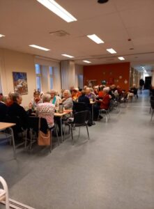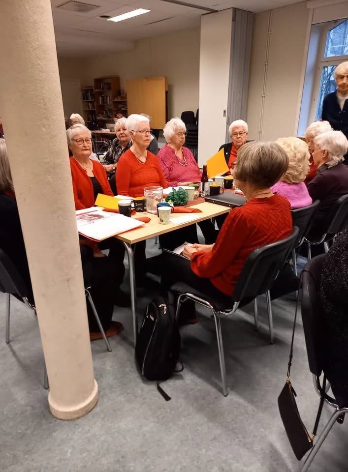 Idag var vi cirka 100 personer som träffades på Seniorcentrum. Började med lite information och därefter allsång med Sånglärkorna som klätt sig i rött. Sen kom maten som var en kall jultallrik och en varm låda. Mycket gott. Med julmust därtill. Kaffe och pepparkaka. Lite mer information. En del tog mat med sig hem. För det var rikligt.