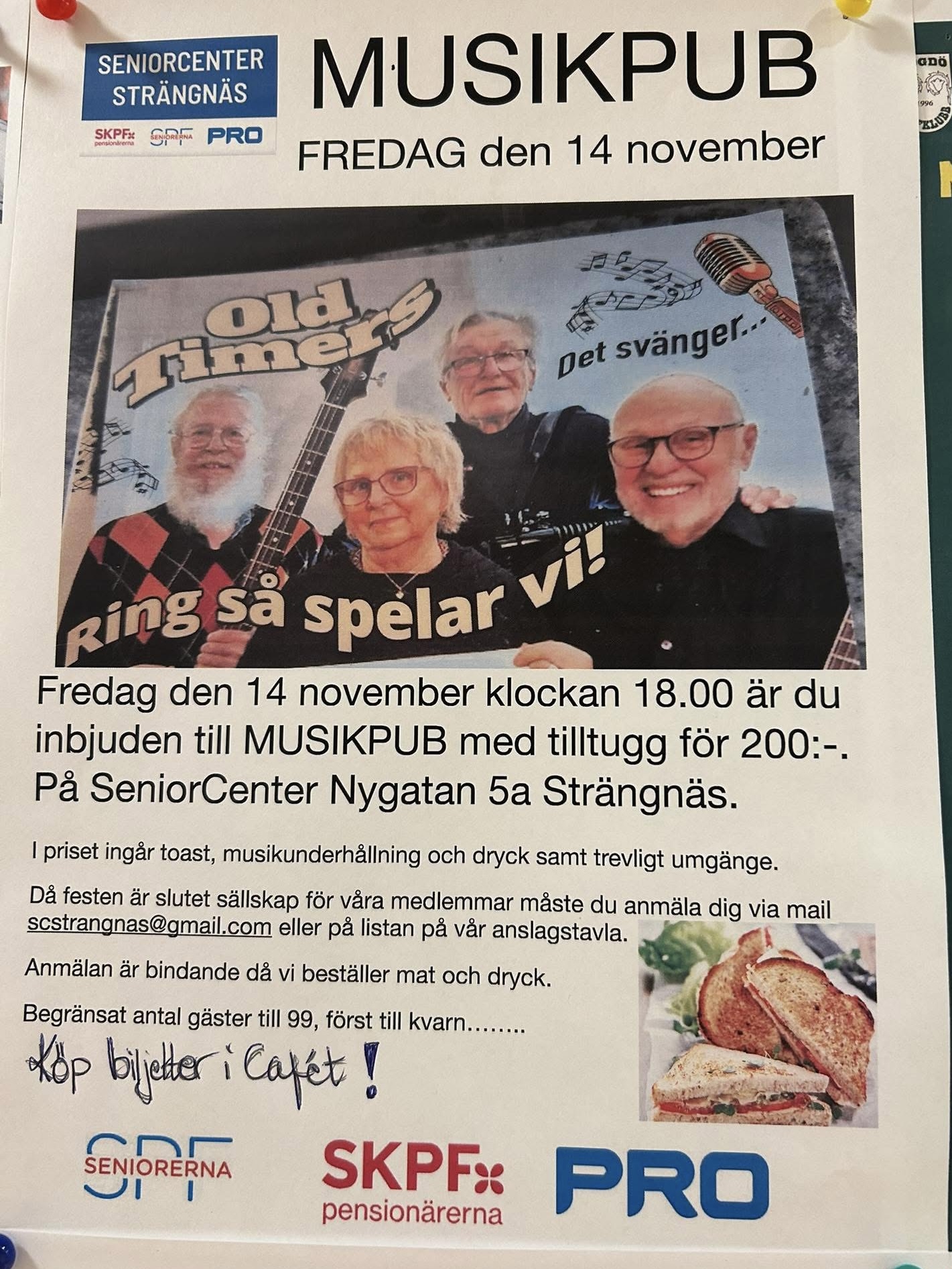 Här kommer en inbjudan till MUSIKPUB den 14 november i Seniorcenter Strängnäs Förköp biljetter i cafét och skriv upp dig på anslagstavlan. Först till kvarn …… gäller 😉