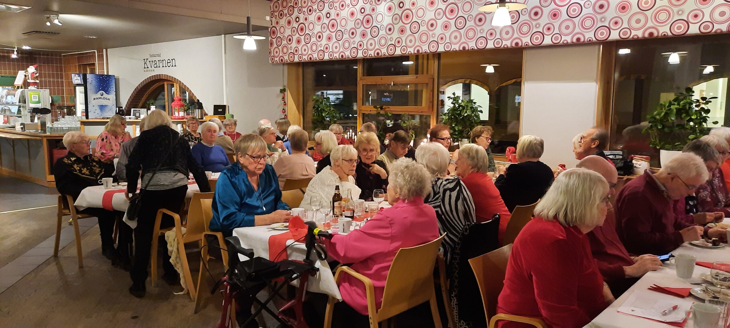 Den 29 november var vi 54 personer som träffades på Kvarnen för att avnjuta deras fina och otroligt goda julbord. Julmust eller öl att dricka till maten. Det fanns mycket goda grejer på det väl tilltagna dessertbordet. Efter kaffe och lotteri, där vinsterna bestod av stickat som stickgruppen skänkt, var alla mätta och nöjda .