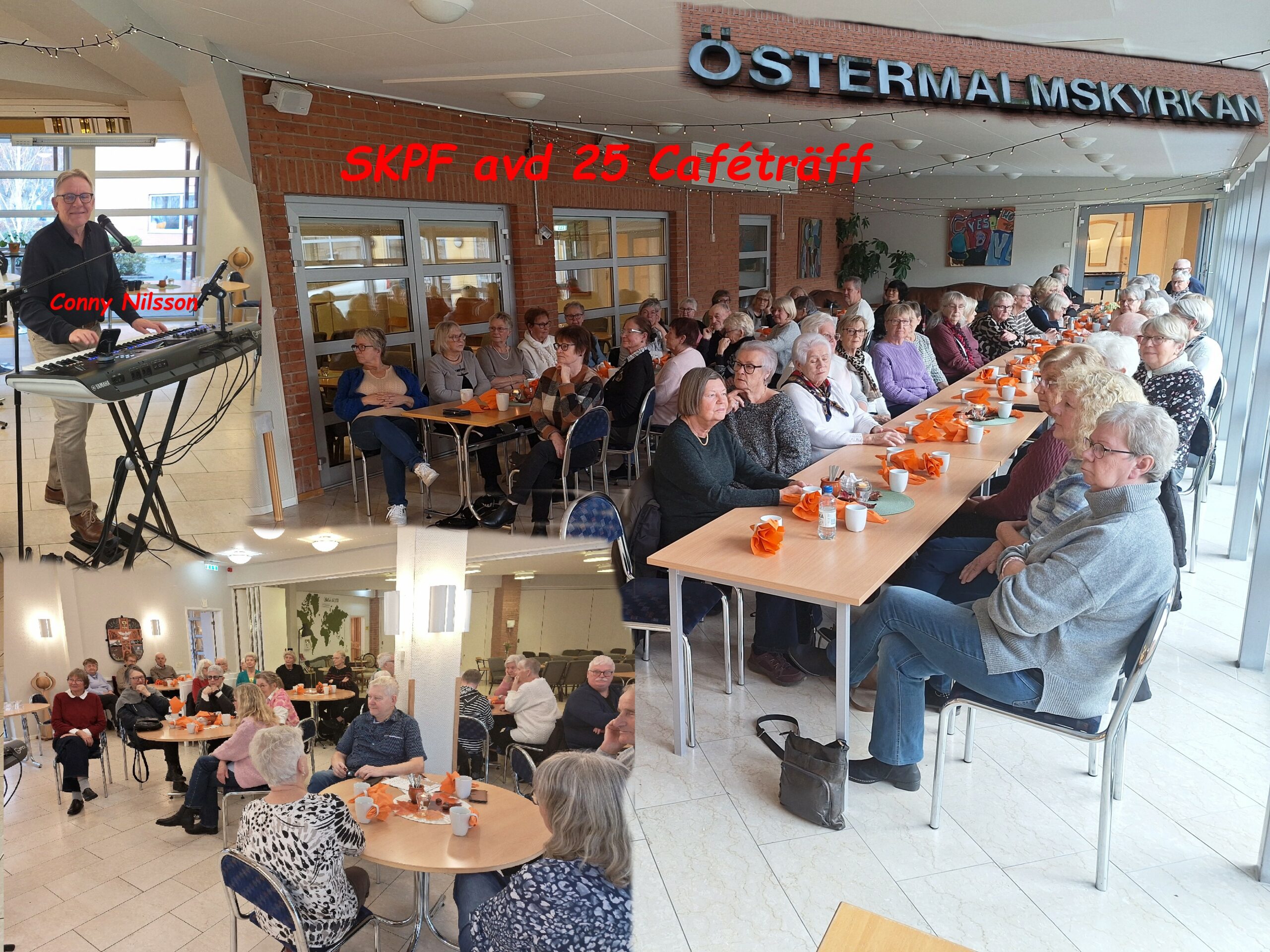 SKPF avd 25 Caféträff den 18 nov år 2025 med underhållning i samlingslokalen Östermalmskyrkan i Kristianstad