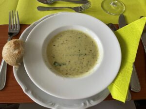 Förrätt: Grön sparrissoppa som serverades med kuvertbröd och smaksatt smör.