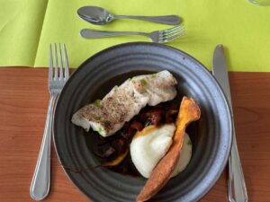 Varmrätt: Torsk Bourguignon Ångad torsk, potatispuré, bakad morot, rödvinssås, champinjoner och sidfläsk.